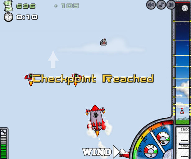 Into Space. Launch a rocket into the skies with the goal of reaching space in the shortest amount of days possible. Control the rocket with mouse.